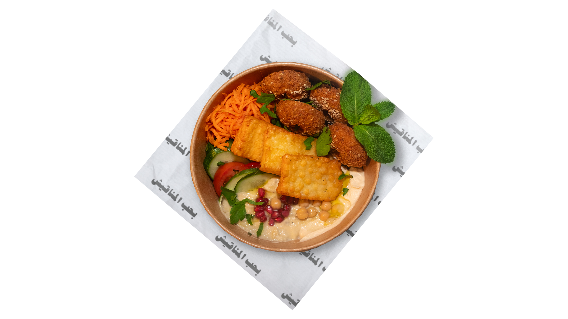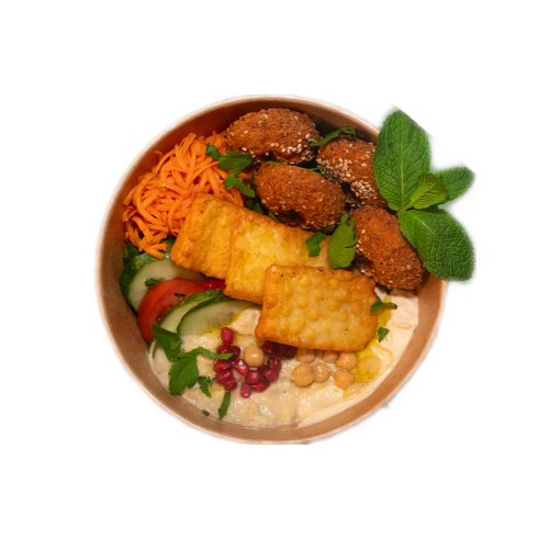 Arabisches Brot, Falafel,Halloumi, Humus, Salat, Sauße nach Wahl.