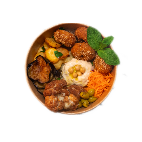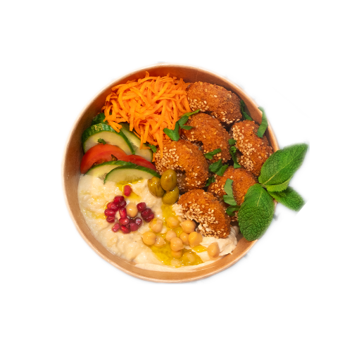 Falafel, gegrilltes Gemüse, Hummus, Salat.